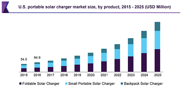 Foldable solar panels have become popular, followed by small portable charges and then Backpack solar chargers.